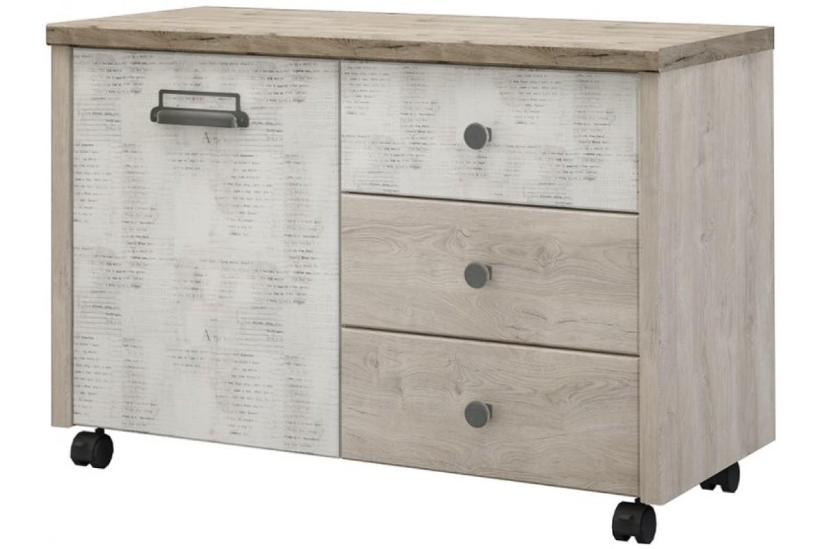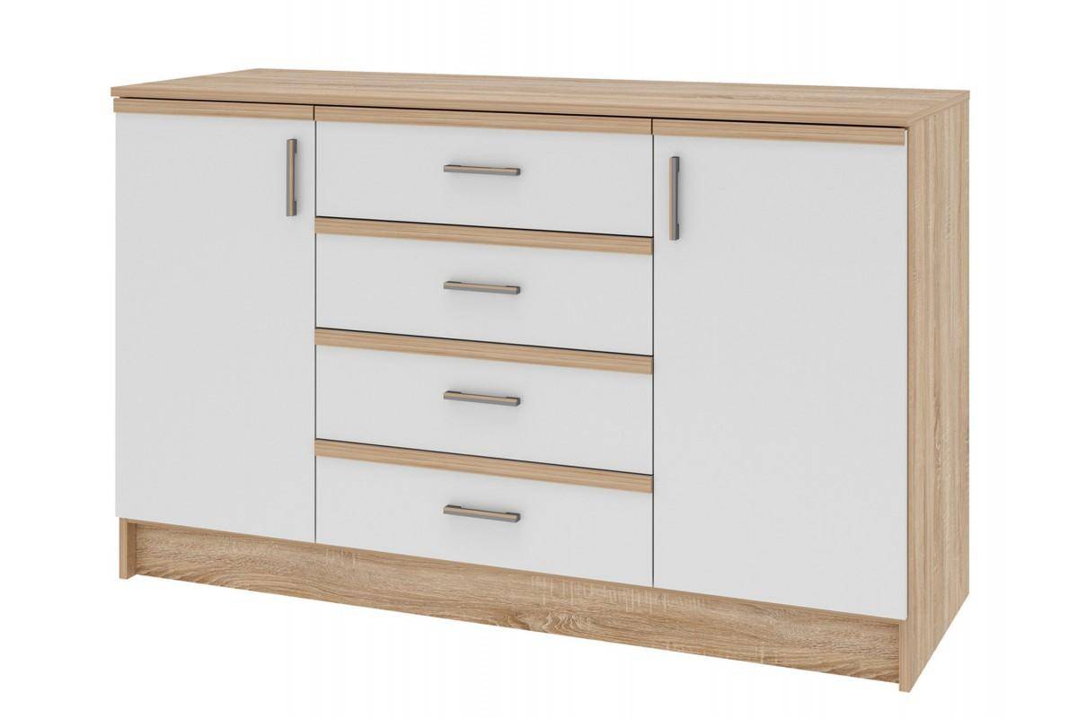 Современный комод с распашными дверцами, выдвижными ящиками и открытыми полками
