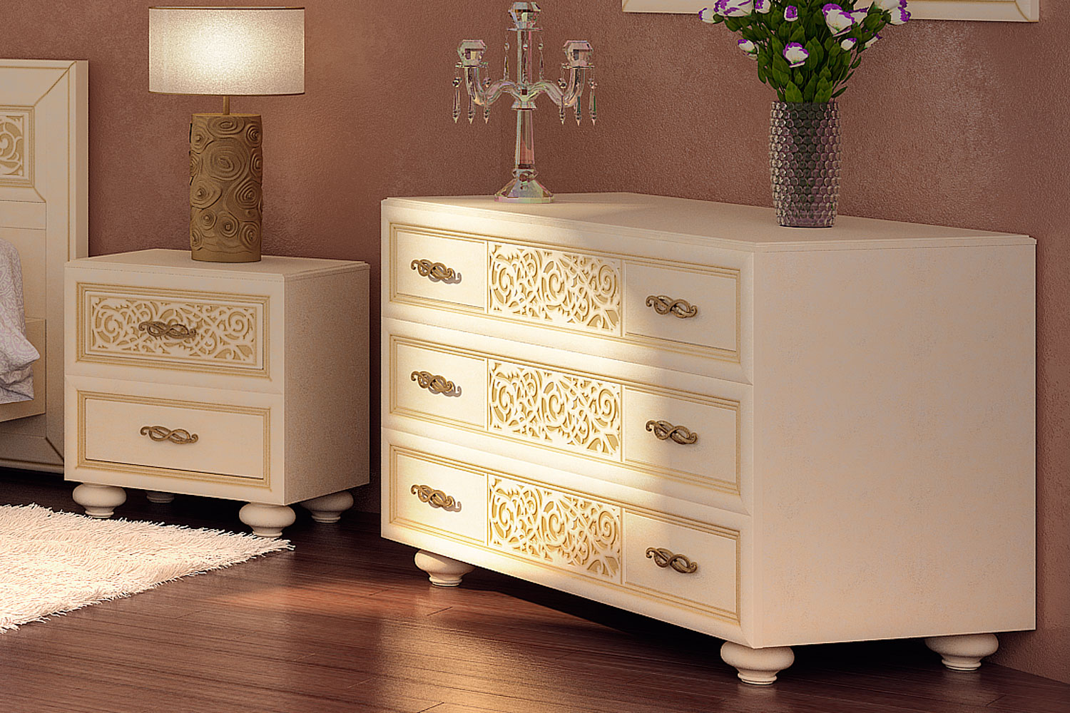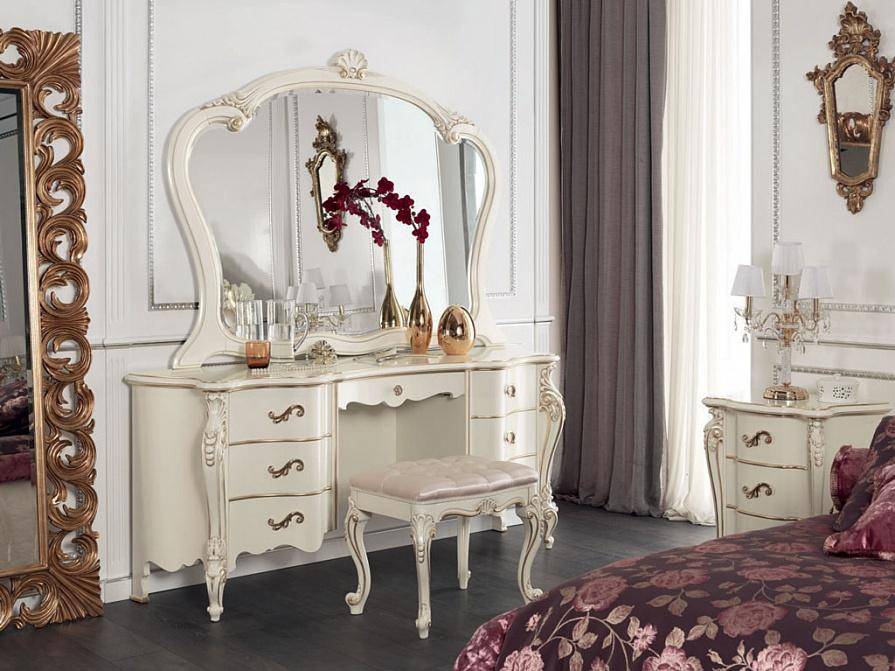 - зеркало в спальне над комодом, а также множество различных декоративных элементов в виде резьбы или росписи способствуют красивому оформлению комнаты, что придает изысканность и роскошный вид интерьеру.