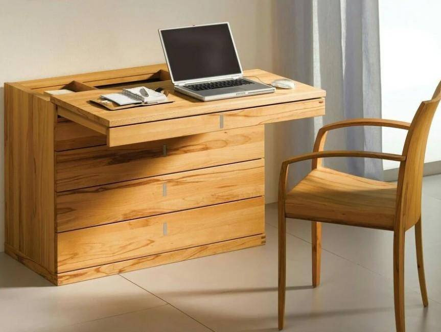 - Комод-стол – оснащается секцией для компьютера со свободной нижней зоной для системного блока и ног. Это современная модель, позволяющая совместить письменный стол с бельевыми ящиками.