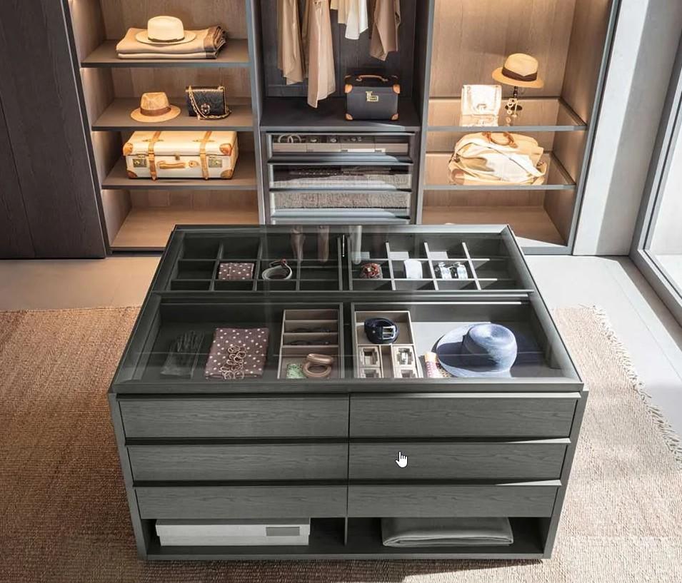 - комбинированный с ящиками, полками, секциями с распашными дверцами;