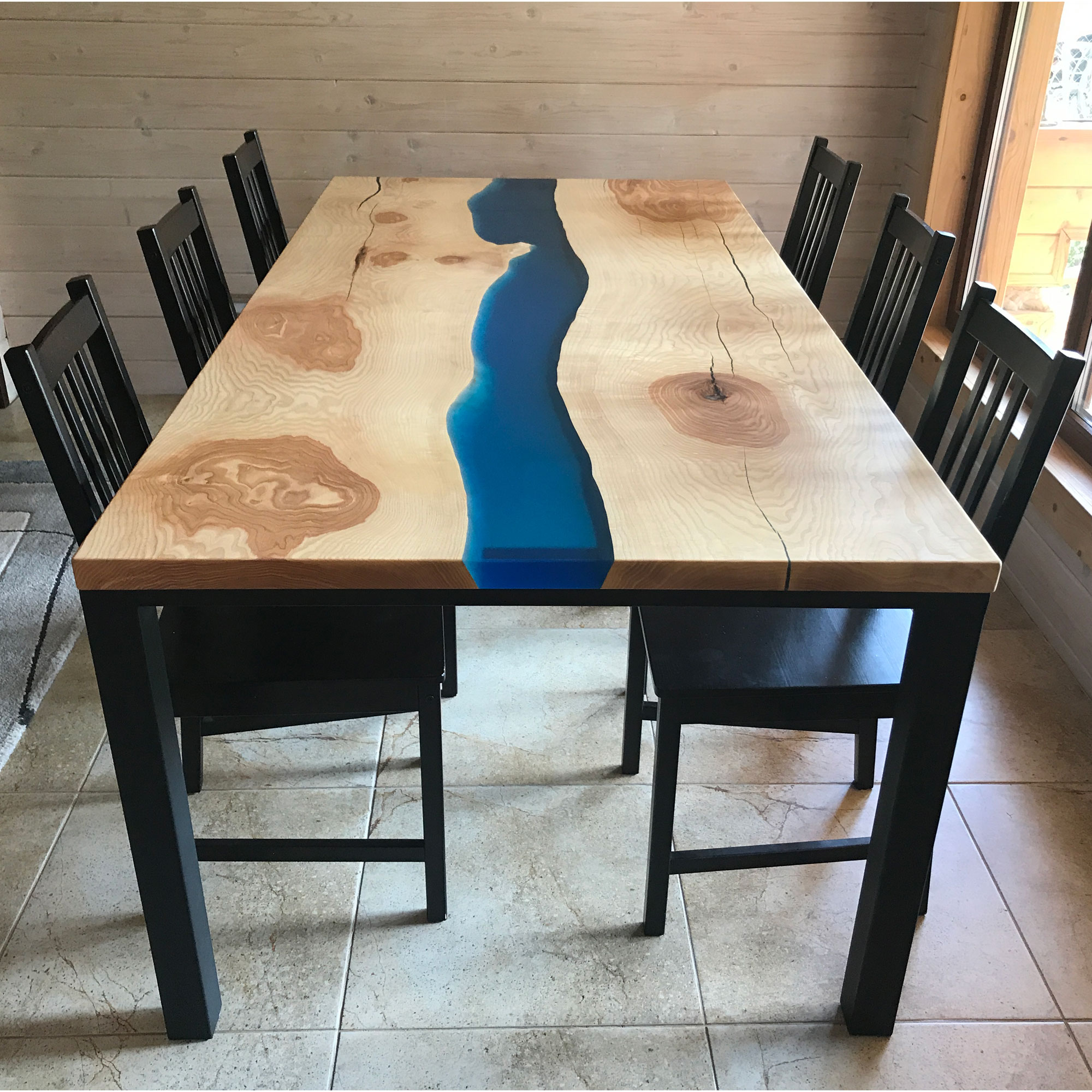 Держится тенденция на “реки” из эпоксидной смолы. Обычно такие модели изготавливают на заказ по индивидуальным параметрам.