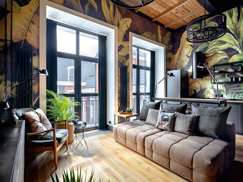 Это направление дизайна помещения не имеет строгих требований к внешнему виду обоев. Здесь может быть уместен практически любой принт – от абстракции до цветочного. Можно даже использовать обои, имитирующие каменную кладку, деревянные спилы или штукатурку.