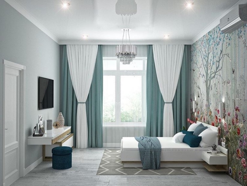 У светлой спальни больше возможностей, в ней можно использовать яркие элементы, однако основной тон лучше выбрать так же светлый, но холодный. Голубой, серый, белый, мятный. Эти оттенки будут освежать спальню, поддерживая баланс света.