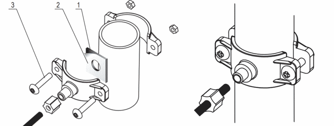 Надо приложить хомут к трубе и наметить место входа шланга для слива. В намеченном месте просверлить отверстие диаметром 7 мм. Установить хомут с прокладками на трубу и затянуть болтами. Вставить трубку в хомут и закрепить гайкой.