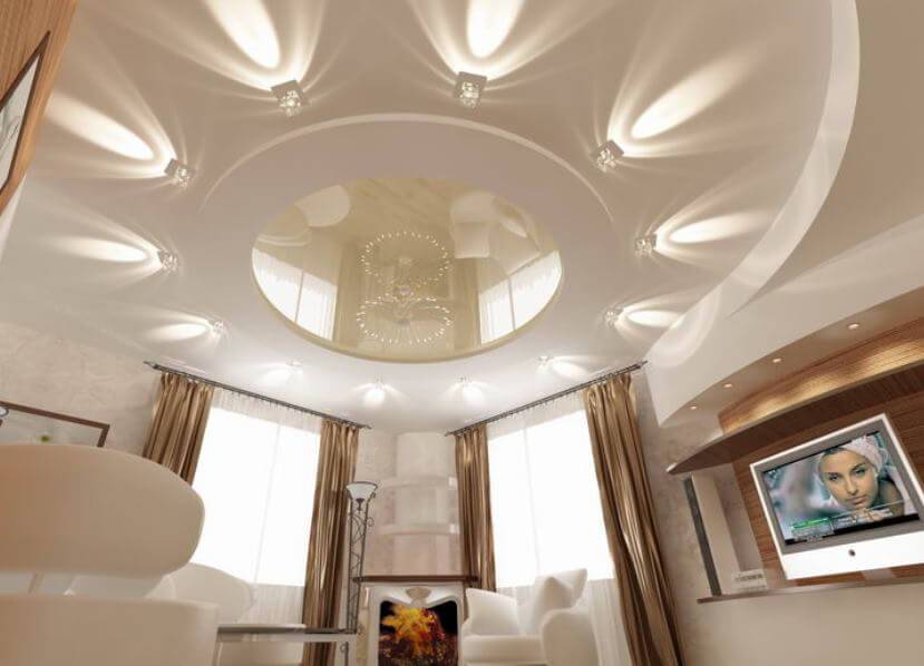 Натяжные потолки в интерьере гостиной.
