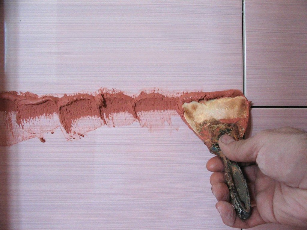- Смесь наносят резиновым шпателем непосредственно на место стыка плиток, тщательно утрамбовывая ее внутрь, не допуская пустот.