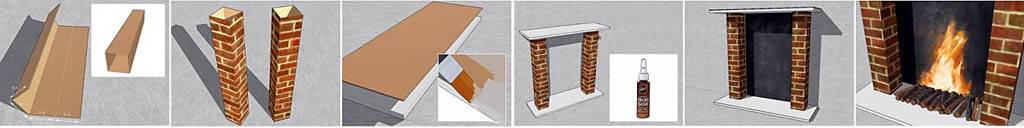 В конце всю конструкцию обклеивают бумагой, а затем создают имитацию кирпичной кладки вырезанными из картона «кирпичиками», обоями или самоклейкой снаружи и внутри.