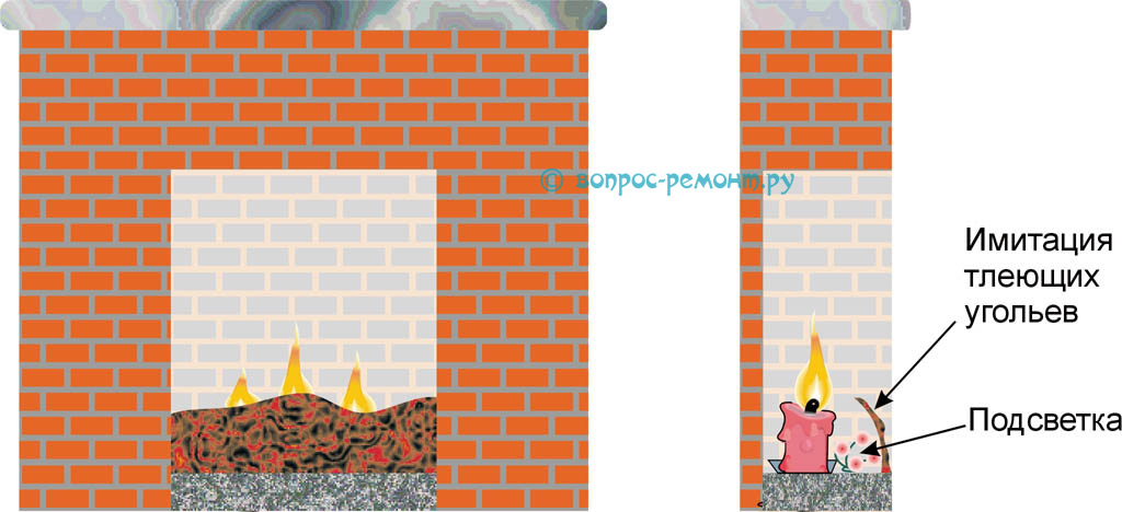 Способ дополнить описанную выше имитацию отблесков пламени и недогоревших дров натуральными язычками огня известен – это свечи в негорючих плошках, см. рис.: