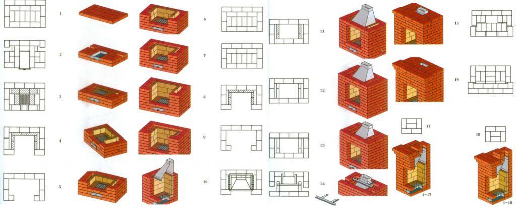 Порядовка камина-печи из кирпича выглядит следующим образом (с наглядными изображениями):