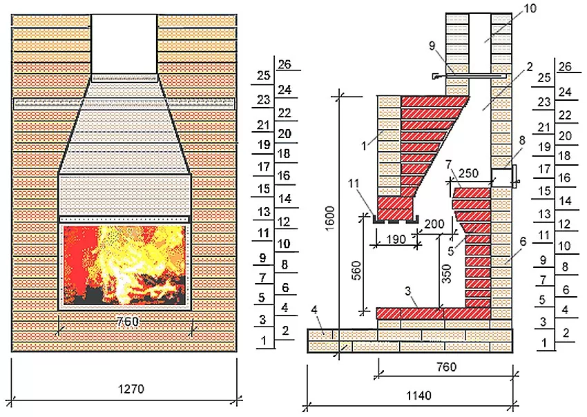 Схема, порядовка и чертеж камина из кирпича
