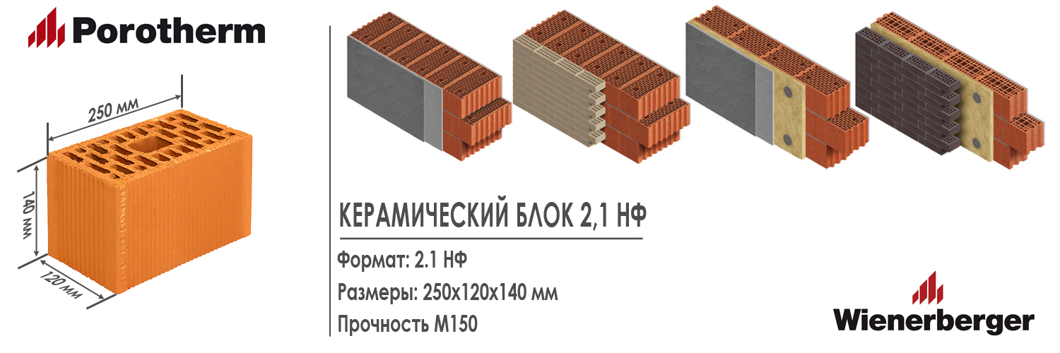 По теплотехническим показателямПри одинаковой толщине стены из керамического блока и двойного пустотелого кирпича Вы экономите на материале, но проигрываете в теплотехнике! Покажем на примере лидера рынка Wienerberger Porotherm. PTH51 или 2,1 НФ (510mm) – на 30% теплее (PTH)! PTH44 или 2,1 НФ (440mm) – на 26% теплее (PTH)! PTH38 или 2,1 НФ (380mm) – на 23% теплее (PTH)!