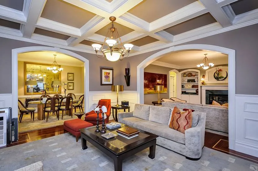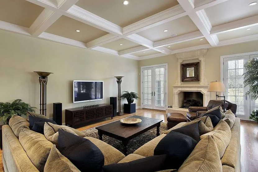 Если в доме небольшая по площади гостиная, необязательно отказываться от украшения потолочного пространства. Чтобы комната с кессонным потолком имела гармоничный вид, понадобится тщательная проработка дизайна с учетом следующих тонкостей: