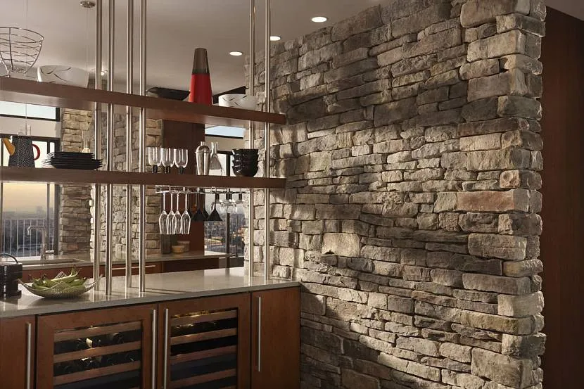 Декоративный кирпич для внутренней отделки следует отличать от декоративного камня. Камень, натуральный или искусственный, не имеет ровной прямоугольной формы и создает более «дикий» интерьер, напоминая средневековый замок.