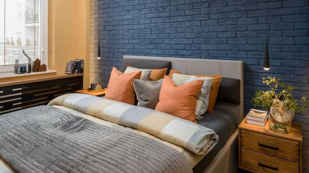 Кирпичная стена в спальне должна сочетаться, например, с аксессуарами и стенами темно-синего и золотого цветов, а также голубого и серого. Они будут красиво сочетаться с красным цветом кирпича, внося в интерьер впечатление порядка и умиротворения.