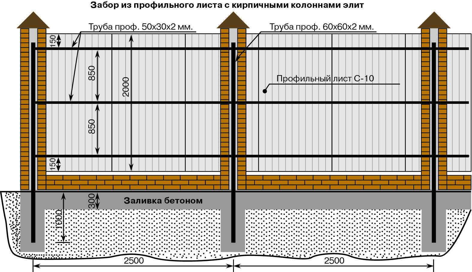 Высота столбов обычно варьируется от 2 до 2,5 метров. Это оптимальные размеры, подходящие при заполнении пролетов сеткой или профнастилом. Выше забор делать не рекомендуется – для этого потребуется углублять и усиливать фундамент, чтобы он выдержал воздействие ветра. Это особенно актуально, если пролеты будут выполнены из профнастила, который имеет большую парусность.