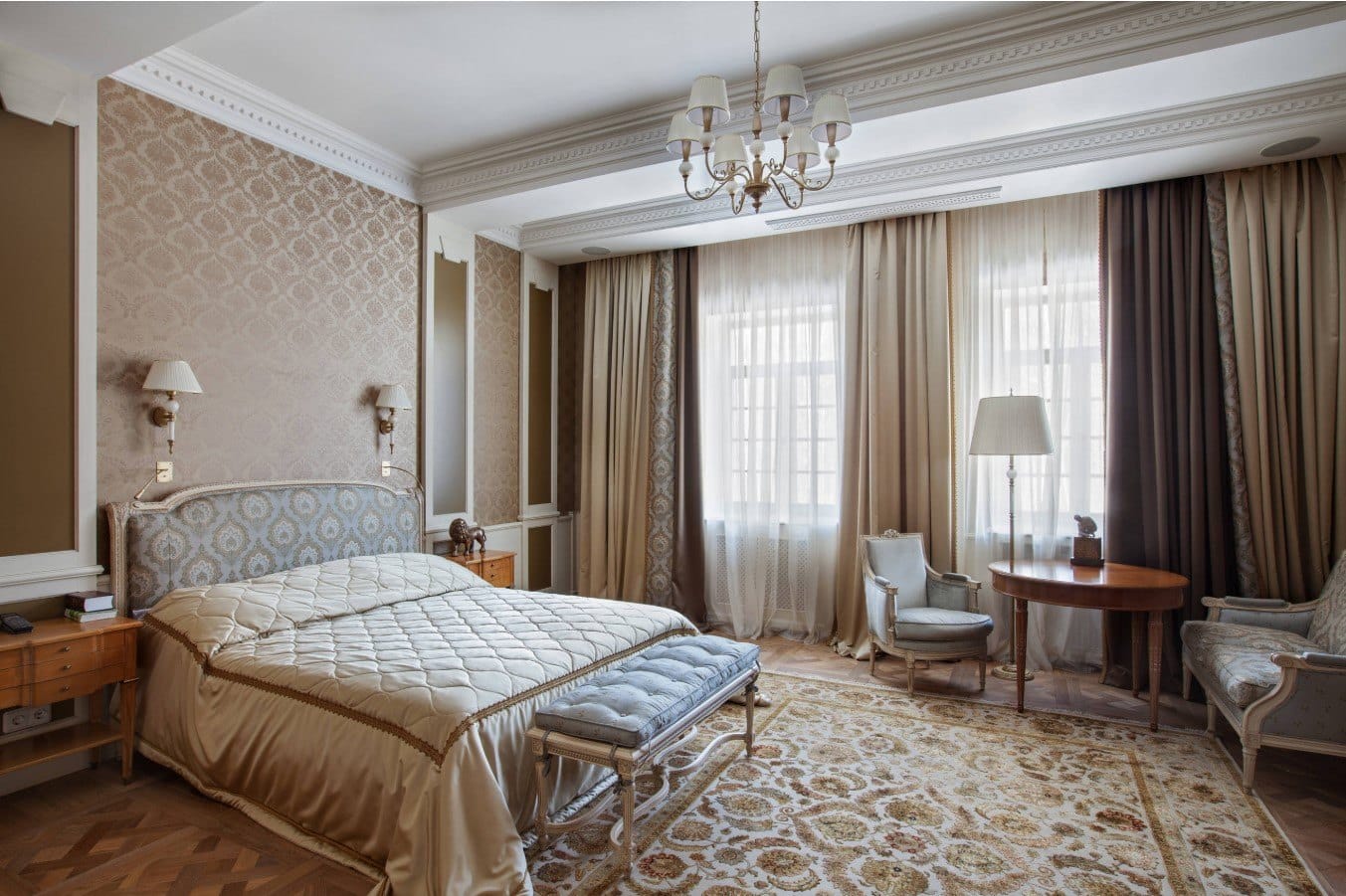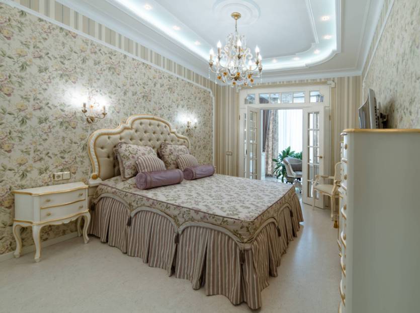 В таком помещении соединяется изысканная роскошь с монументальностью. По-королевски будет выглядеть спальня, оформленная в теплых светлых тонах. Допускается использование растительного орнамента, мягкой кожи или лепнины.