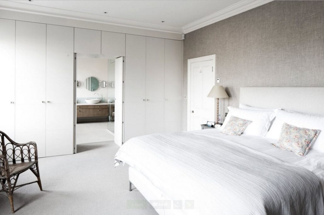 Если спальня длинная и узкая, на коротких стенах размещаются светлые обои, часть которых как бы «прячется» за углом. Это помогает выровнять геометрию спальни.