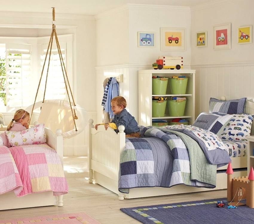 Отдельно стоит отметить, что разделение в детской комнате для двоих разнополых детей до года не столь существенное. Оно основывается на элементарном удобстве родителей, поскольку малыши абсолютно не самостоятельные. И тем не менее они нуждаются в своих индивидуальных спальных местах, скорее всего в общих шкафах и стеллажах, но с личными полочками. Зона игр у них будет общей. Это положительно скажется на совместном взрослении и понимании окружающего мира.