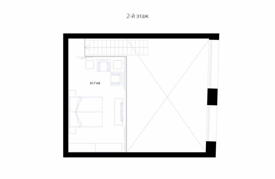 Под горизонтальным перекрытием компактно размещается сразу несколько помещений: прихожая, закрытая гардеробная с раздвижной дверью и санузел. Вдоль одной из стен выстроена современная лестница на антресоль (в спальную зону)