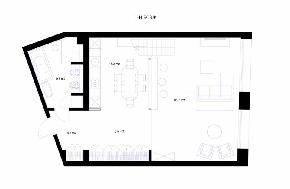 Для того, чтобы создать лаконичный и функциональный интерьер, дизайнеры решили использовать открытую планировку и демонтировали все стены, которые не были несущими. Полученное пространство поделили на две зоны: техническую и жилую. В технической зоне расположили маленькую прихожую и сантехнический блок, в жилой оборудовали кухню-столовую, выполняющую одновременно роль гостиной.