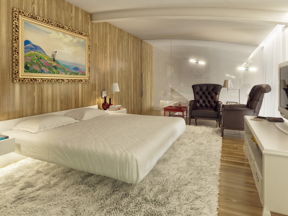 - Создать просторную гостиную. Не обязательно планировать помещение так, чтобы в нем была лишь спальня. Можно все расставить так, чтобы расширить гостевую зону, используя перекрытия, стекло, оптические трюки и многое другое.