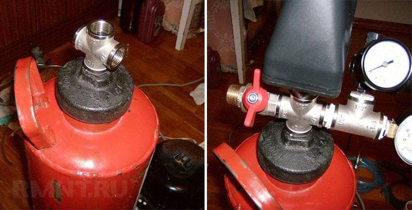 - Подготовка ресивера. В качестве ресивера используют пустой баллон огнетушителя, предварительно сняв с него клапан. Внутрь баллона заливают средство от ржавчины и оставляют его на необходимое время. Снаружи емкость также очищают от грязи и ржавчины. Когда баллон высохнет, на отверстие от клапана надевают крышку. При необходимости в отверстие вставляют переходник и закрепляют крестовину. Реле давления устанавливают на верхний штуцер. Тройник с манометром привинчивают с одной стороны выключателя, с другой — устанавливают предохранительный дроссель. Дроссель можно заменить на вентиль (для ручного выпускания воздуха). Если необходимо, применяют переходники и красят резервуар.
