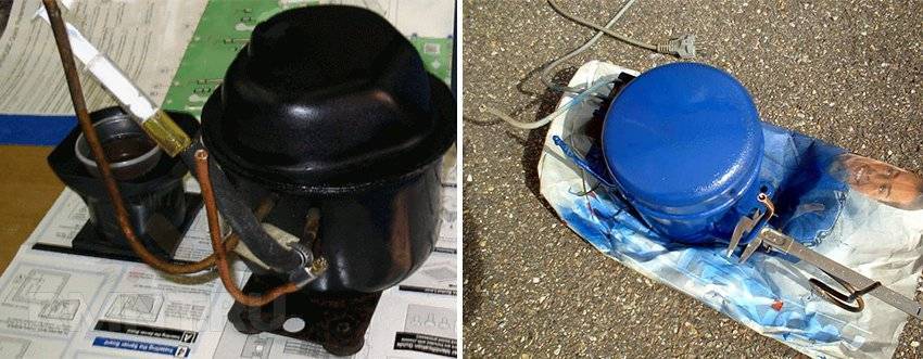 Из мотор-компрессора выходят три трубки, две из которых открыты (вход и выход воздуха), а третья, с запаянным концом — для замены масла. Чтобы найти вход и выход воздуха, нужно ненадолго подать на компрессор ток и нанести на трубки соответствующие отметки.