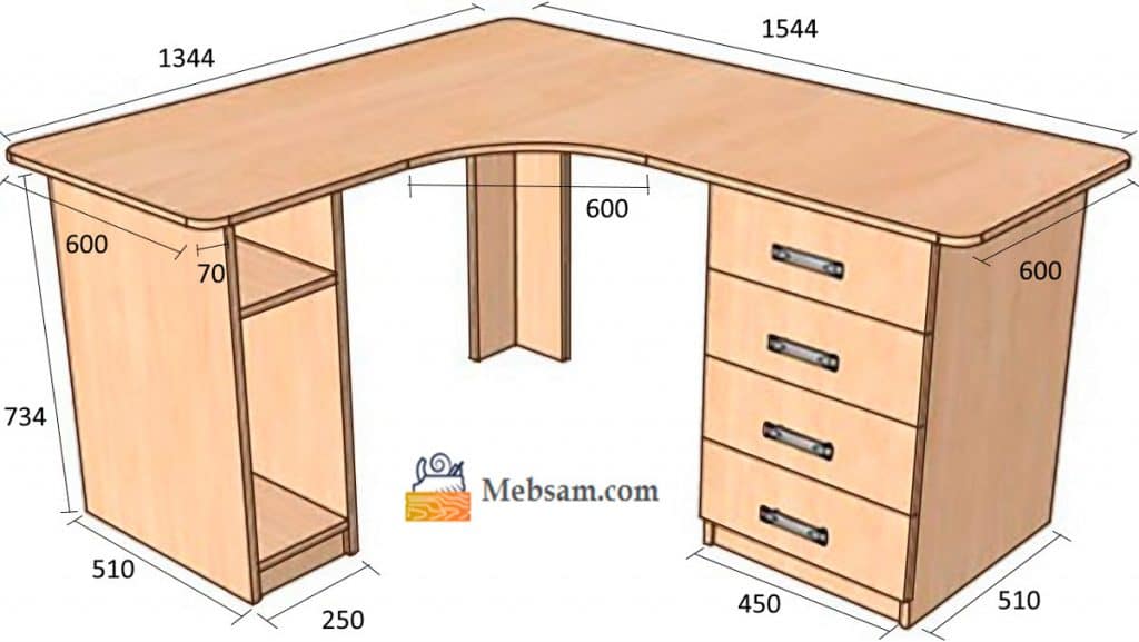 Перед тем, как делать угловой стол для компьютера своими руками, нужно составить чертеж с деталировкой и размерами всех составляющих. Рассчитываются размеры следующим образом: