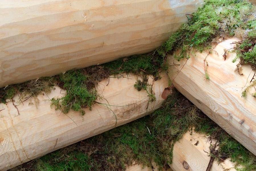 - Если используется мох для конопатки, то его следует обработать специальным раствором из мыла и масла в соотношении 200:500, смешанными с ведром воды.