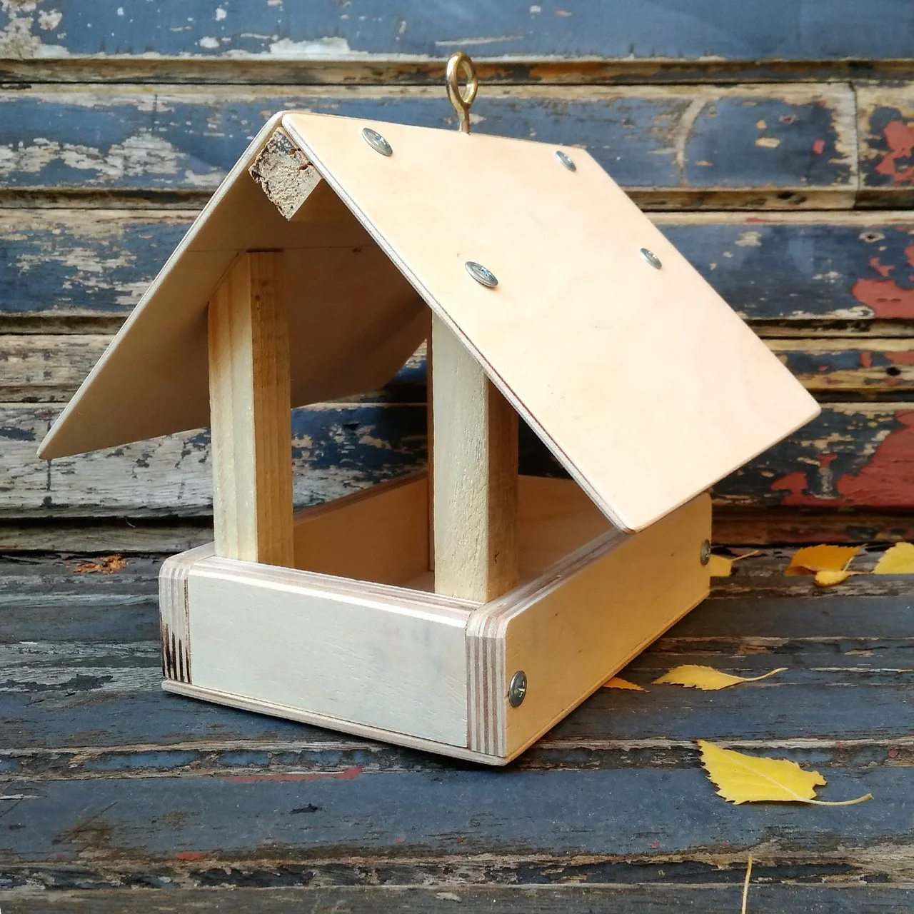 Видите на фото симпатичный такой, аккуратный домик? Перед вами очень простая кормушка для птиц из фанеры на платформе.