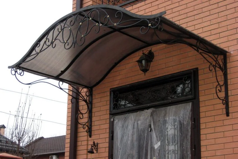 Надежность. Мы не случайно поставили этот пункт первым в списке. Установленный над крыльцом козырек должен выдерживать вес снега, не бояться даже сильных порывов ветра. Когда выбран некачественный материал кровли, он быстро деформируется. Чтобы добиться хорошей прочности, используйте жесткий кованый каркас, позаботьтесь о его правильной установке.