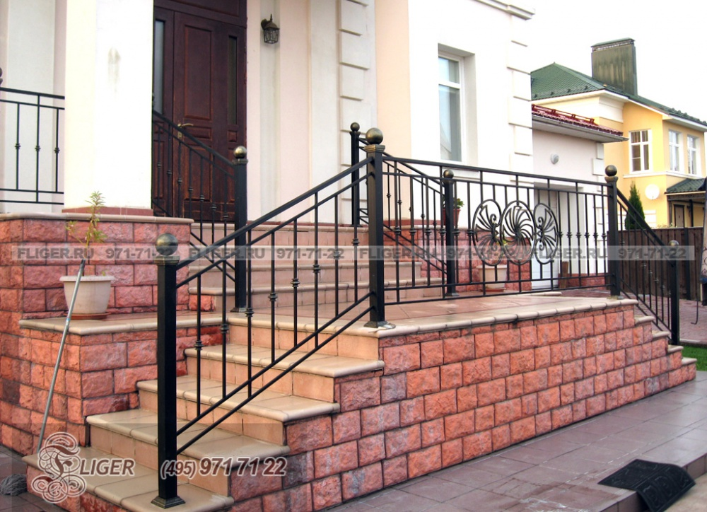 Важно! Высокое крыльцо коттеджа (1,5-2,0 м.) необходимо обязательно оформлять перилами. Это позволяет не только украсить фасад, но гарантировать безопасность и комфорт передвижения по ступеням