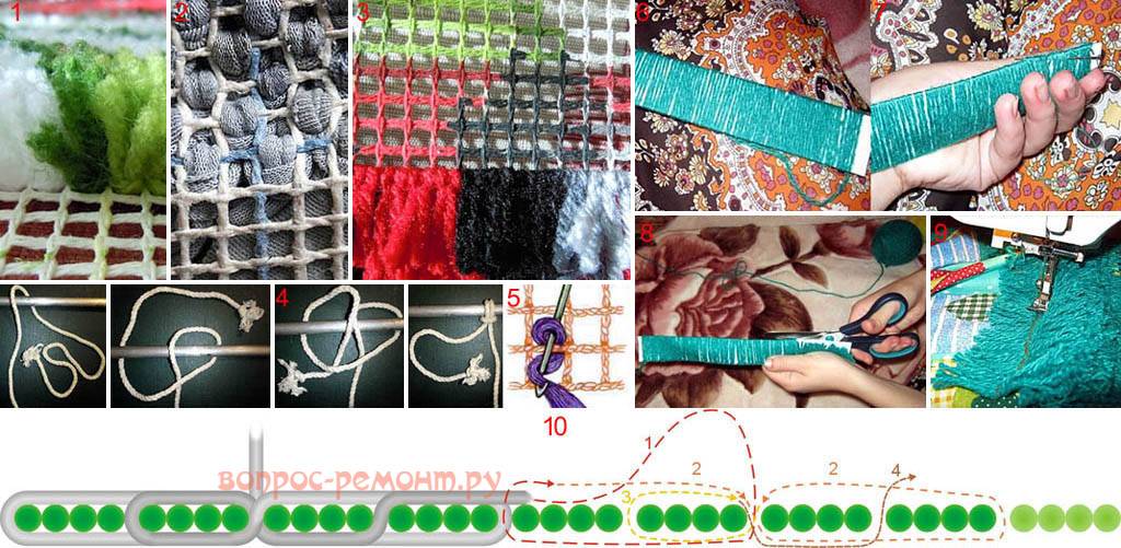 Настоящие узорные ворсистые ковры – тема необъятная, как и вся история ковроделия. Но сделать небольшой простенький коврик-травку в домашних условиях не составит большого труда. Первый способ – вязка узлами к строительной сетке. Пропиленовый (этот пластик практически не электризуется) или капроновый пушистый канатик позволяет получить ворс высотой до 5 и даже 10 см, поз. 1 на след. рис.