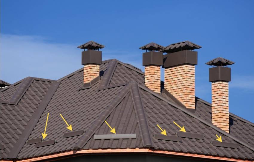 Внимание! Для испарения влаги из-под металлочерепицы обустраивают свободный приток воздуха через естественную вентиляцию. Ее каналы проходят от конька до карниза.. Устройство вентиляции кровли предусматривает соблюдение 50 мм зазора между гидроизоляционным покрытием и металлочерепицей