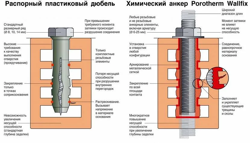 - Керамоблоки плохо подходят для крепления конструкций. На самом деле эта проблема решена почти одновременно с появлением на рынке поризованных блоков —разработкой дюбелей для щелевой керамики (из синтетического материала). Если необходимо закрепить на стене нечто более тяжелое, на помощь приходят химические анкера. Химический состав связывается с материалом блока, образуя монолитное соединение и удерживая стержень. Система выдерживает навесные нагрузки в несколько сот килограмм, что редко реализуется в домашних условиях.