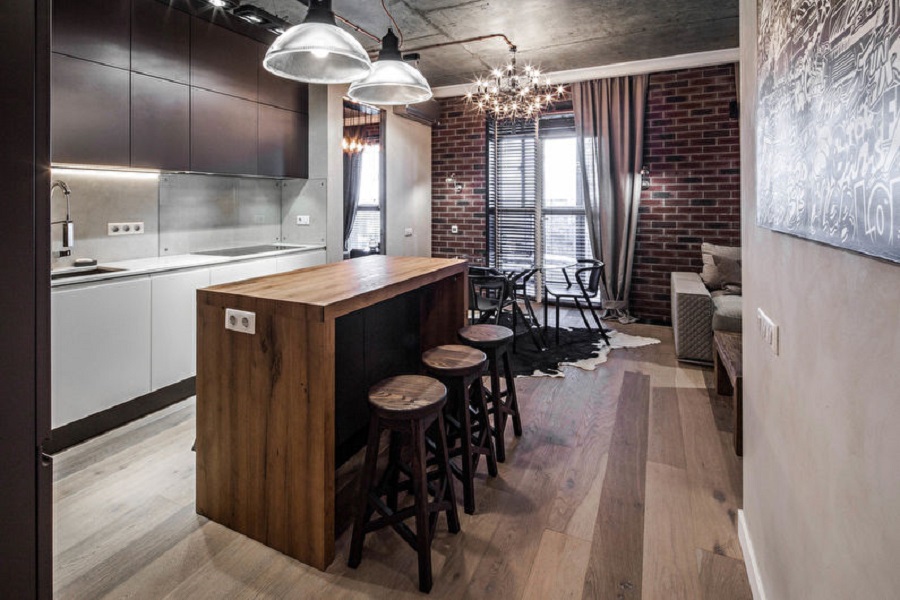 Если кухня имеет небольшую площадь, а хочется оформить ее в модном стиле, то есть вариант выгодного объединения с лоджией – площадь значительно увеличится, а заодно будет больше света. Более правдоподобно смотрится объединенная кухня с гостиной – именно это сочетание создает иллюзию промышленного помещения.