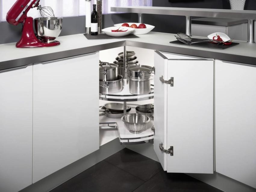 В угловом гарнитуре делайте максимально вместительным угловой модуль, установив систему «умный уголок».