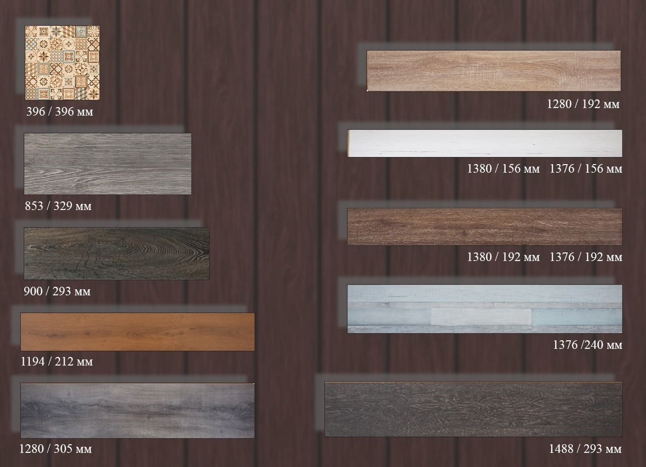 Размер может указывать на то, какой материал она будет имитировать, наиболее распространенные указаны на фото. Например, имитация напольного кафеля имеет ширину 330 мм, деревянного пола от 185 до 195 мм. Их часто используют для отделки кухонь и прихожих.