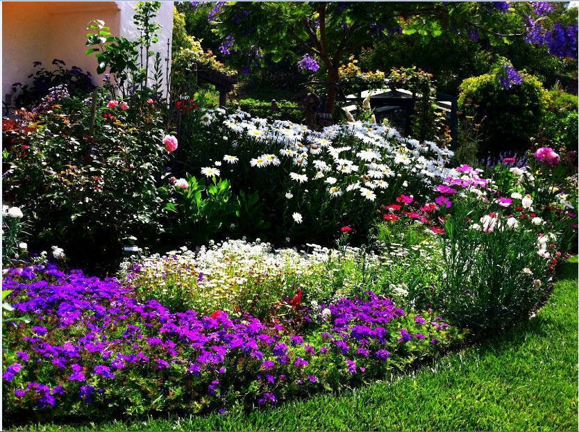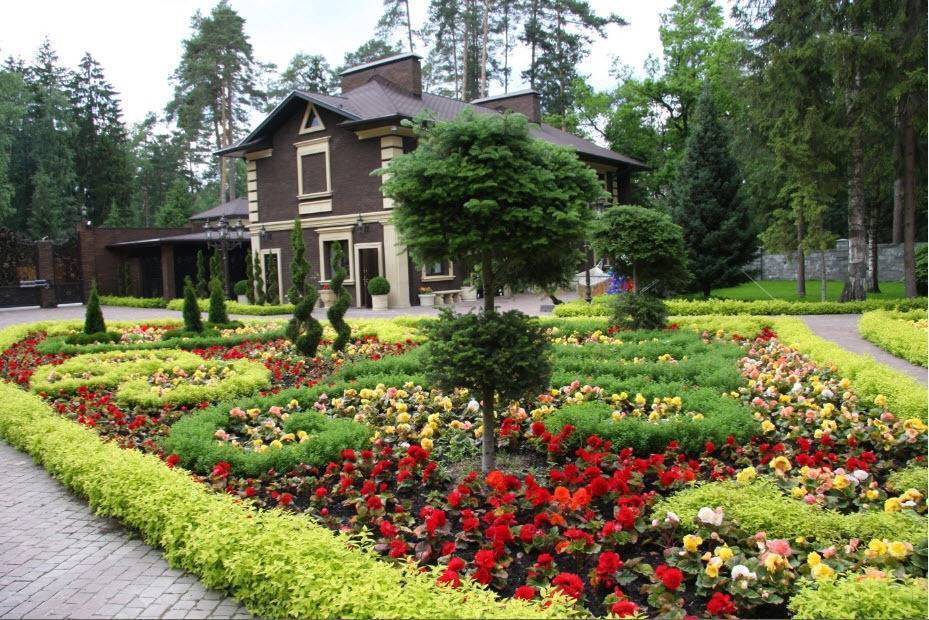 Главными элементами сада являются цветники, которые располагаются по обе стороны от дорожки, ведущей от калитки к крыльцу. Дизайн цветников самый разнообразный, но при их разбивке следует учесть, что пестрость клумб и нагромождение множества видов растительности утомляет взгляд. Ландшафтные дизайнеры рекомендуют перемежать клумбы со стрижеными газонами и разделять их невысокими живыми изгородями.