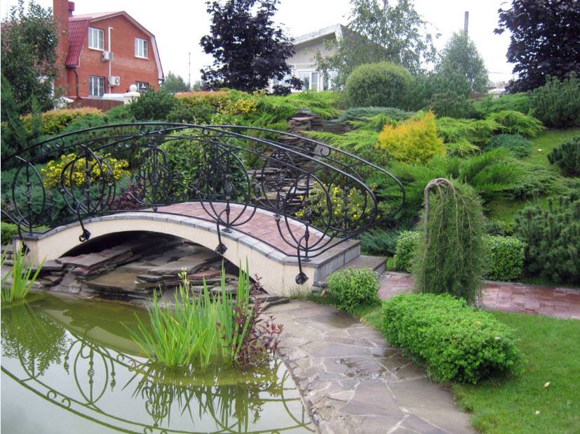 Если размер территории позволяет, уместным будет также небольшой прудик, фонтан или водопад, украшенный растениями, камнями.
