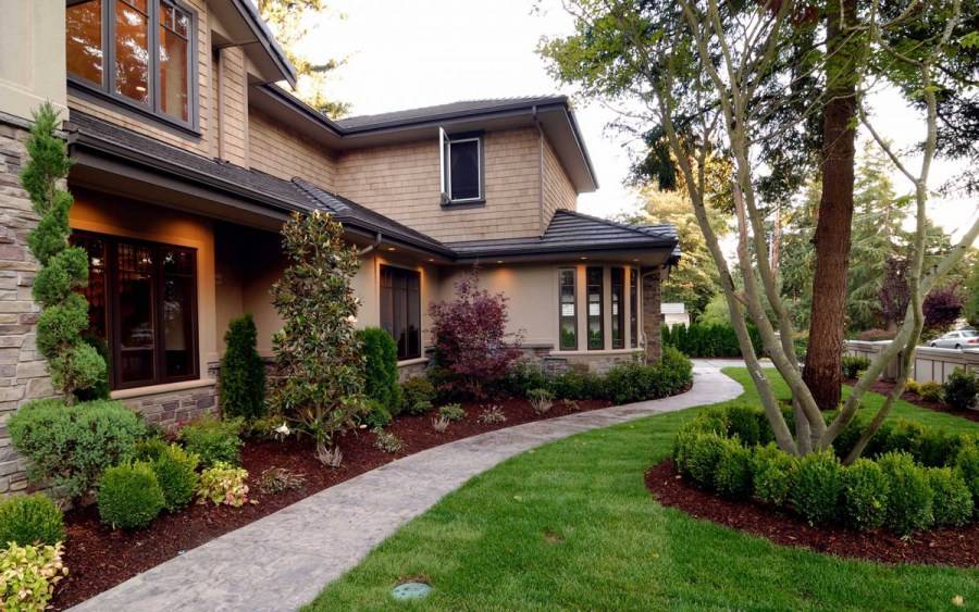 Один из самых популярных элементов дизайна участка в частном доме. На фото зеленые газоны выглядят идеально. Однако нужно понимать, что газон требует постоянного ухода, систематического скашивания травы. Поэтому он подходит в том случае, когда на дачном участке постоянно кто-то обитает или приезжает достаточно часто.