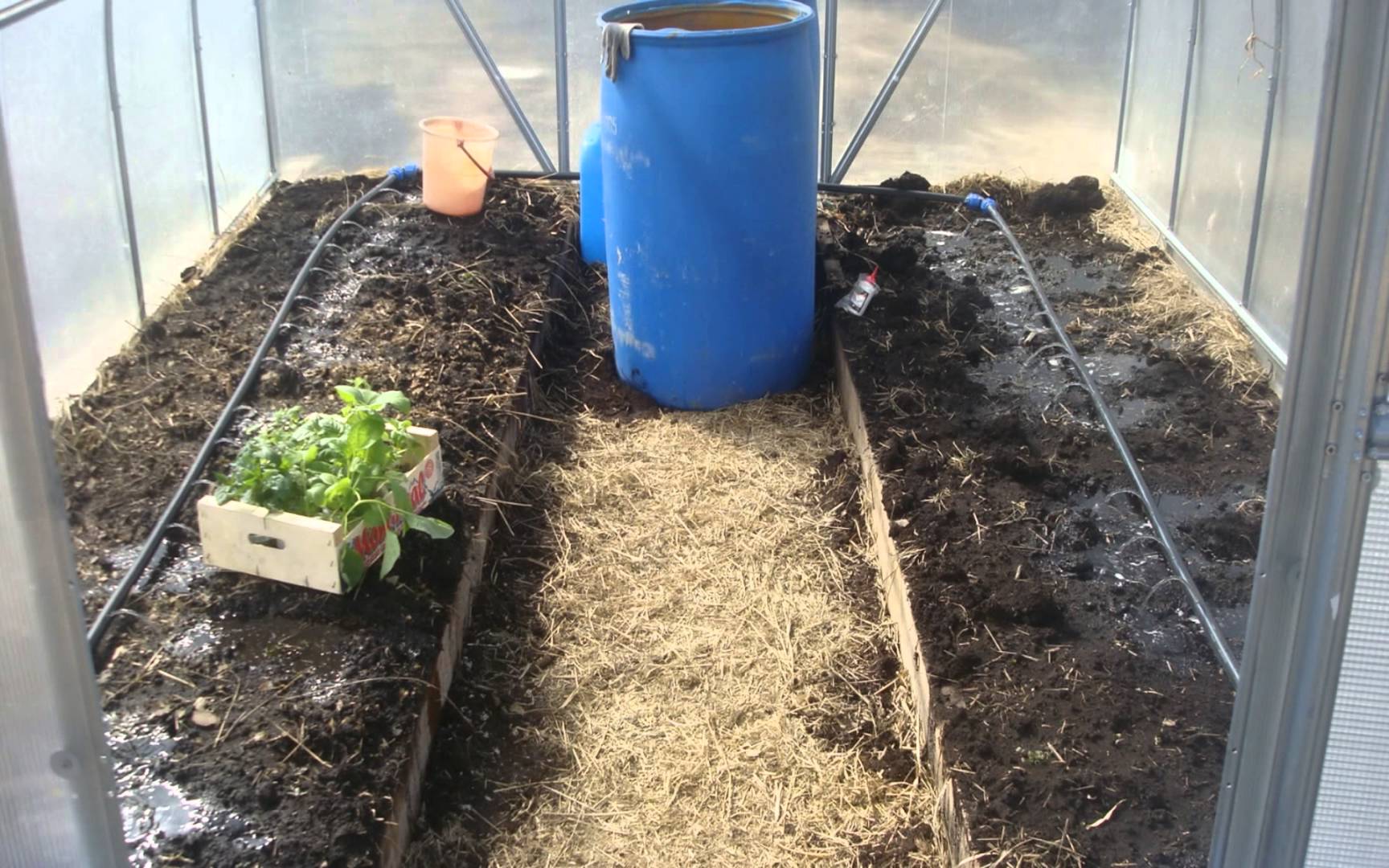 - Емкость с объемом 100 л. Вода будет нагреваться под действием солнечных лучей, что благотворно влияет на растения.