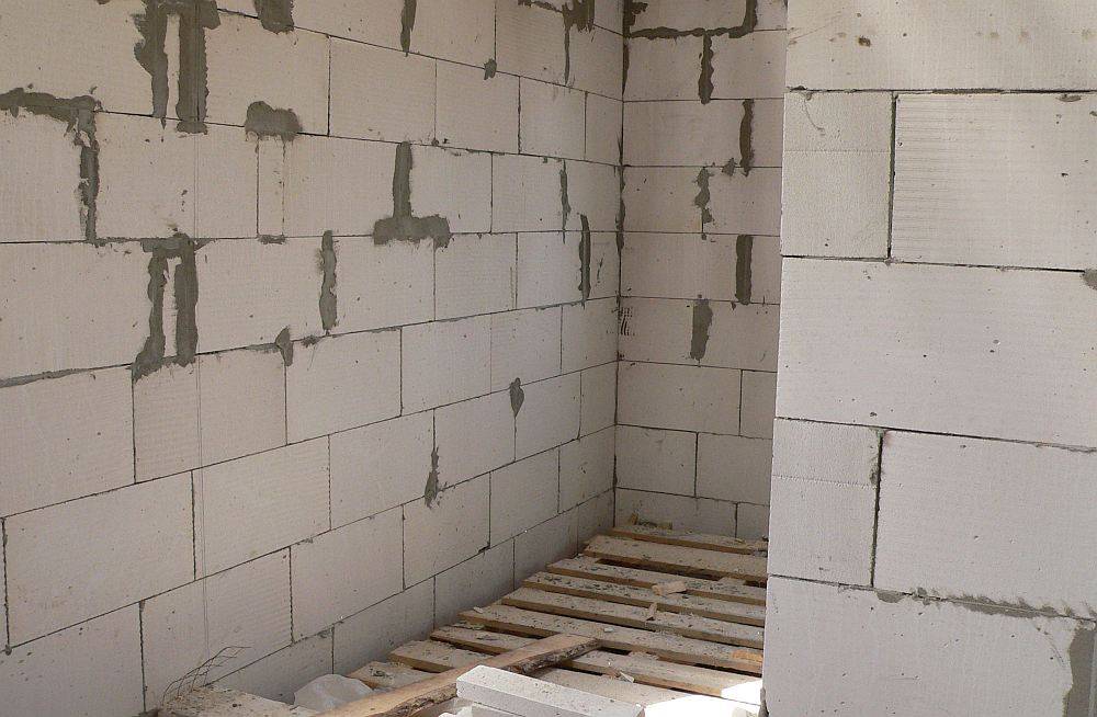 При одновременном возведении внутренних перегородок с внешними стенами первый ряд соединяют раствором. Уже во втором ряду блок внутренней стены заходит на 15 см в наружную. При строительстве внутренних стен позже на наружных стенах выполняют штробы соответственного размера.