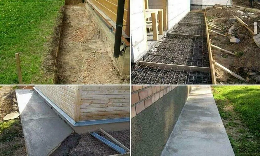 По окончании заливки отмостки дома, поверхность бетона затягивается пленкой и в течение нескольких дней увлажняется, чтобы прошла реакция гидратации, монолит набрал прочность. Опалубка демонтируется после того, как бетонный раствор вокруг дома окончательно схватится через 15 дней.