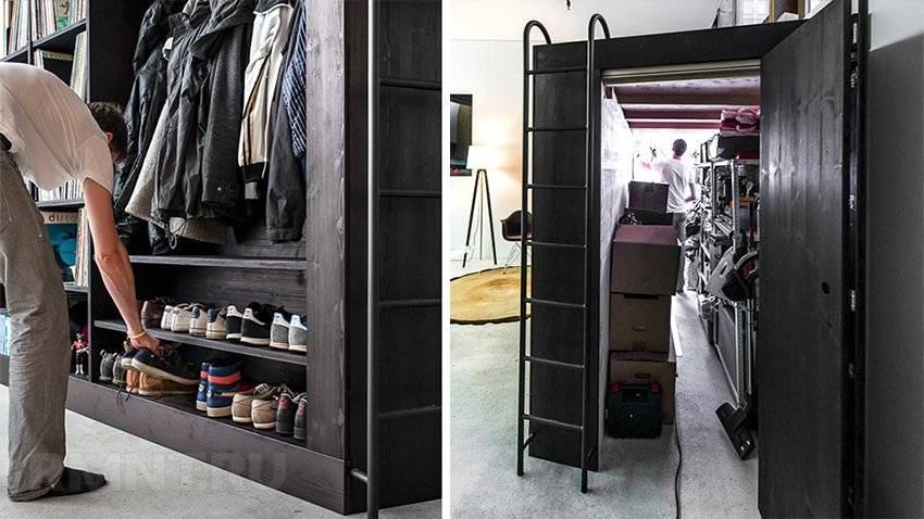 Ещё один вариант – кровать, складывающаяся в офисные стеллажи. Рабочее место легко превращается в спальное, преобразуясь в кровать с решётчатым основанием. Забраться на неё не составит особого труда. Для этого специально была сконструирована удобная лестница.