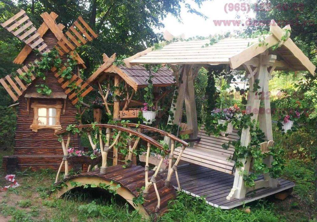 Другой оригинальный вариант – оформить беседку декоративной мельницей – можно построить беседку прямо внутри конструкции, но такое строение возвести своими руками непросто, ведь вам понадобится большое количество материалов, а также опыт в строительстве.