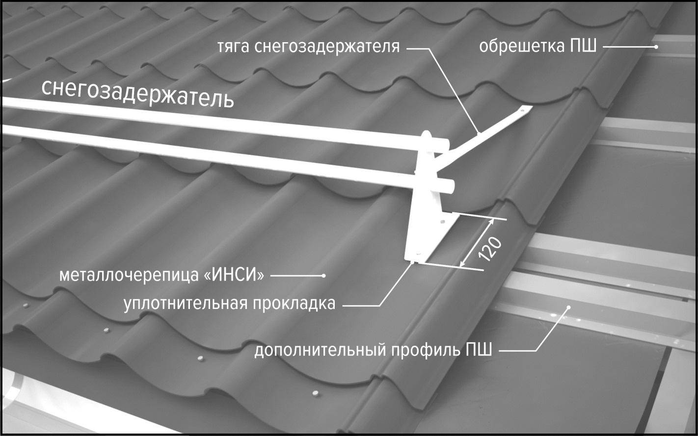 Для предотвращения схода больших масс снега устанавливаются снегозадержатели. Конструкция снегозадержателя состоит из кронштейнов и труб. Кронштейны устанавливаются в прогиб волны и крепятся через металлочерепицу и резиновую уплотнительную прокладку к обрешетке крыши. В местах установки для крепления кронштейна заранее монтируется дополнительный обрешеточный профиль на расстоянии 120мм (по осям профилей обрешетки). Снегозадержатели устанавливаются выше кровельного ограждения. При отсутствии кровельного ограждения снегозадержатели устанавливают не ниже третьего ряда обрешётки. При длине ската более 10метров рекомендуется устанавливать два ряда снегозадержателей. В районах с большим количеством снеговых осадков предусматривается установка тяги кронштейна. Тяга снегозадержателя крепится одним концом к кронштейну, другим– к другому обрешеточному профилю через уплотнительную прокладку и лист металоочерепицы (см. рис. 38).