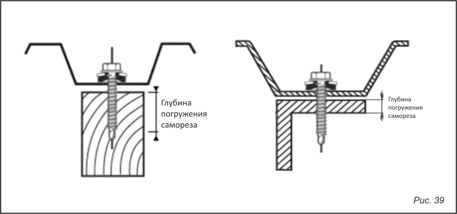 Шаг установки кронштейнов снегозадержания зависит от снегового района строительства, конструкции кровли, крепёжного элемента. Разработаны рекомендации по расчету шага установки кроншейнов. Расчет выполнен исходя из применения саморезов диаметром 4,8 мм. Глубина погружения саморезов показана на рис. 39.