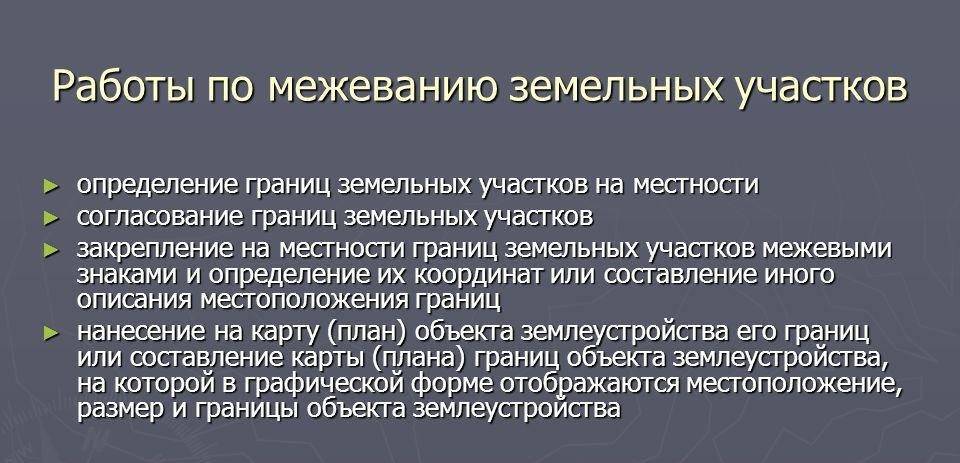 Согласно разработанной методической базе межевание представляет собой работы, связанные с установлением на территории границ муниципалитета, границ наделов. Такие границы подлежат закреплению знаками межевки и определение координат. Межевание включает в себя несколько видов работ, которые закреплены на законодательном уровне: