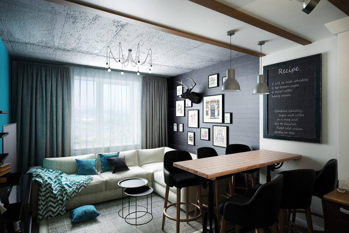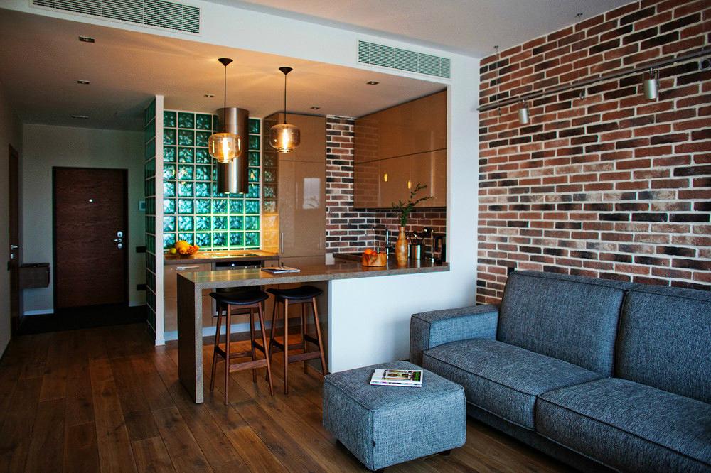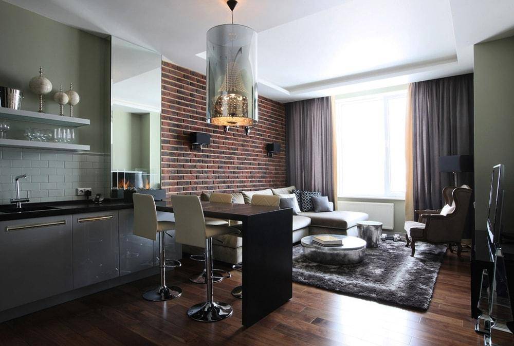 Но, зонировать разные зоны нужно не с помощью стен, а используя стильные перегородки. Это может быть обычная барная стойка, которая и разделит помещение на зоны, и позволит создать функциональный элемент интерьера.